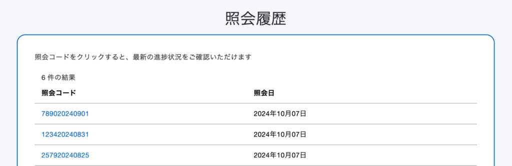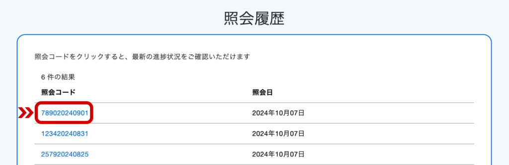 照会履歴を確認する 目次 1.「照会履歴」をクリック2. 照会履歴を確認する3. 照会コードをクリック4. 照会結果を確認する 1.「照会履歴」をクリック 右上のメニューから「照会履歴」をクリックして照会履歴ページを表示します。 2. 照会履歴を確認する 3. 照会コードをクリック 4. 照会結果を確認する 最終更新日 2024年10月7日 この記事は役に立ちましたか? はい いいえ 関連記事 進捗状況を確認する
